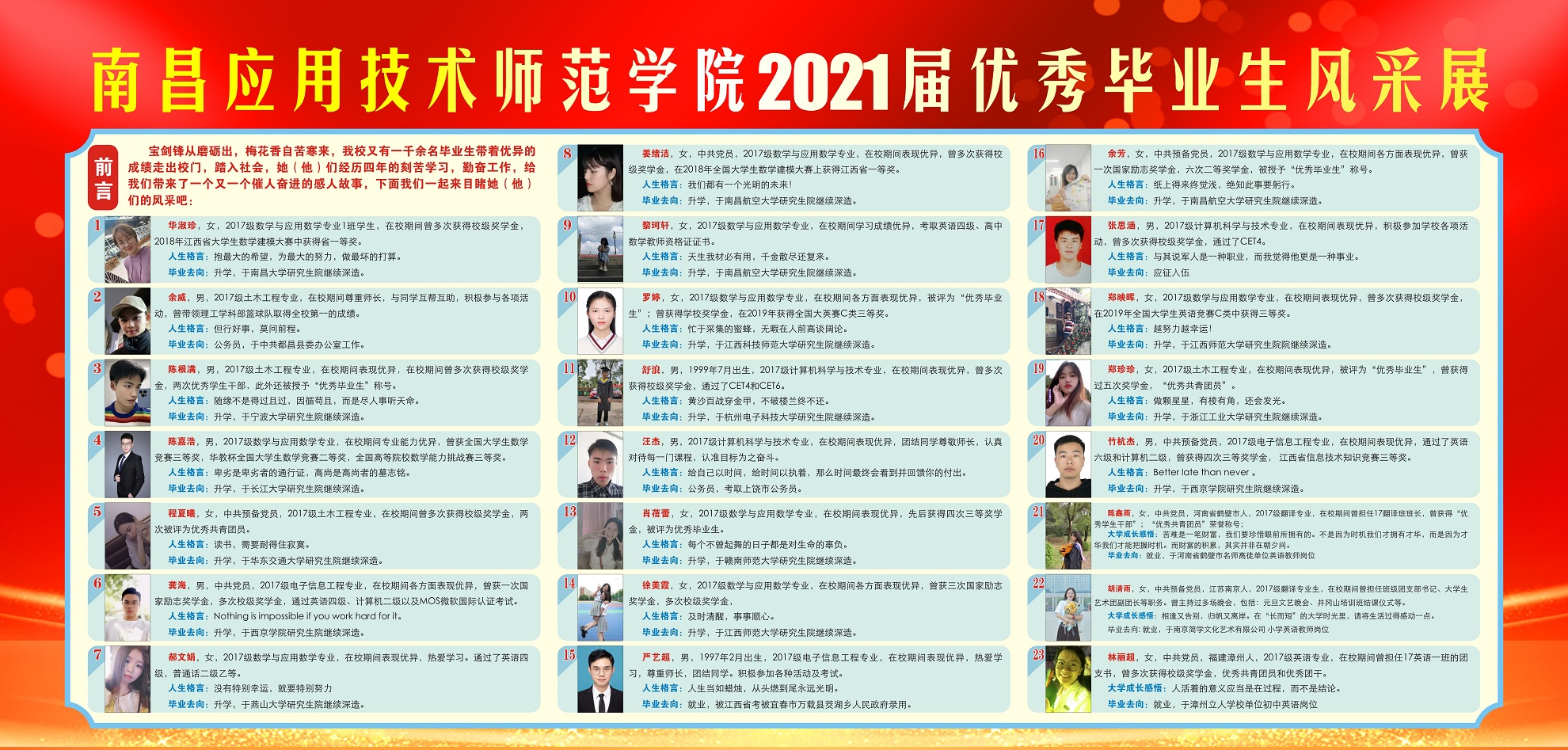 學(xué)生工作 學(xué)工動(dòng)態(tài) 通知公告 部門(mén)簡(jiǎn)介 政策法規(guī) 學(xué)生事務(wù)管理服務(wù)中心 學(xué)生思政教育服務(wù)中心 您現(xiàn)在的位置是:首頁(yè) > 學(xué)生工作 > 學(xué)生思政教育服務(wù)中心 2021屆優(yōu)秀畢業(yè)生風(fēng)采 2021-07-25 文章作者: 瀏覽次數(shù):21799 上一篇 心理健康教育工作方案 下一篇 紅色詩(shī)歌中的黨史《西江月·井岡山》