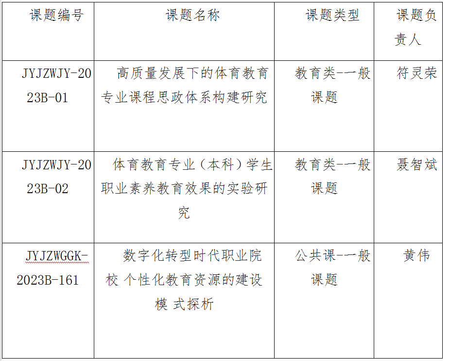 近日,根據(jù)教育部職業(yè)院校教育類專業(yè)教學(xué)指導(dǎo)委員會公布的《關(guān)于公布2023年度教育教指委立項課題及相關(guān)工作的通知》,我校藝術(shù)與體育學(xué)院教師符靈榮主持的《高質(zhì)量發(fā)展下的體育教育專業(yè)課程思政體系構(gòu)建研究》、藝術(shù)與體育學(xué)院教師聶智斌主持的《體育教育專業(yè)(本科)學(xué)生職業(yè)素養(yǎng)教育效果的實驗研究》、教育學(xué)院學(xué)院教師黃偉主持的《數(shù)字化轉(zhuǎn)型時代職業(yè)院校個性化教育資源的建設(shè)模式探析》榮獲立項,是我校首次獲得該項目立項。