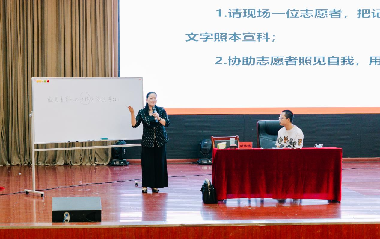 在最令現(xiàn)場震撼的自我照見環(huán)節(jié),有7位同學(xué)爭先恐后“搶奪”一名互動志愿者名額,一位直接“沖上”講臺的男生成為了現(xiàn)場個案,在當(dāng)下特殊的場域和全場師生的陪伴下,進(jìn)行了一次直擊心靈的深度照見,對年少時的一次選擇帶來的人生困擾如同撥云見日般豁然開朗,從而更加端正了自己報名西部計劃的動機(jī),生命狀態(tài)也從對外界的渴求提升到了充滿愛的能量,他迎向老師溫暖相擁的那一刻無不令全場為之動容。