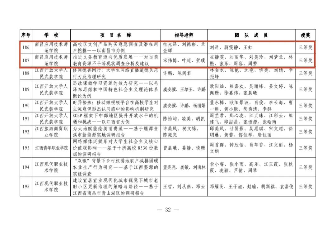 近日,共青團(tuán)江西省委、江西省教育廳等單位聯(lián)合下發(fā)了《關(guān)于第十八屆“挑戰(zhàn)杯”江西省大學(xué)生課外學(xué)術(shù)科技作品競(jìng)賽獲獎(jiǎng)情況的通報(bào)》,我校兩項(xiàng)作品榮獲哲學(xué)社會(huì)科學(xué)類社會(huì)調(diào)查報(bào)告三等獎(jiǎng)。
