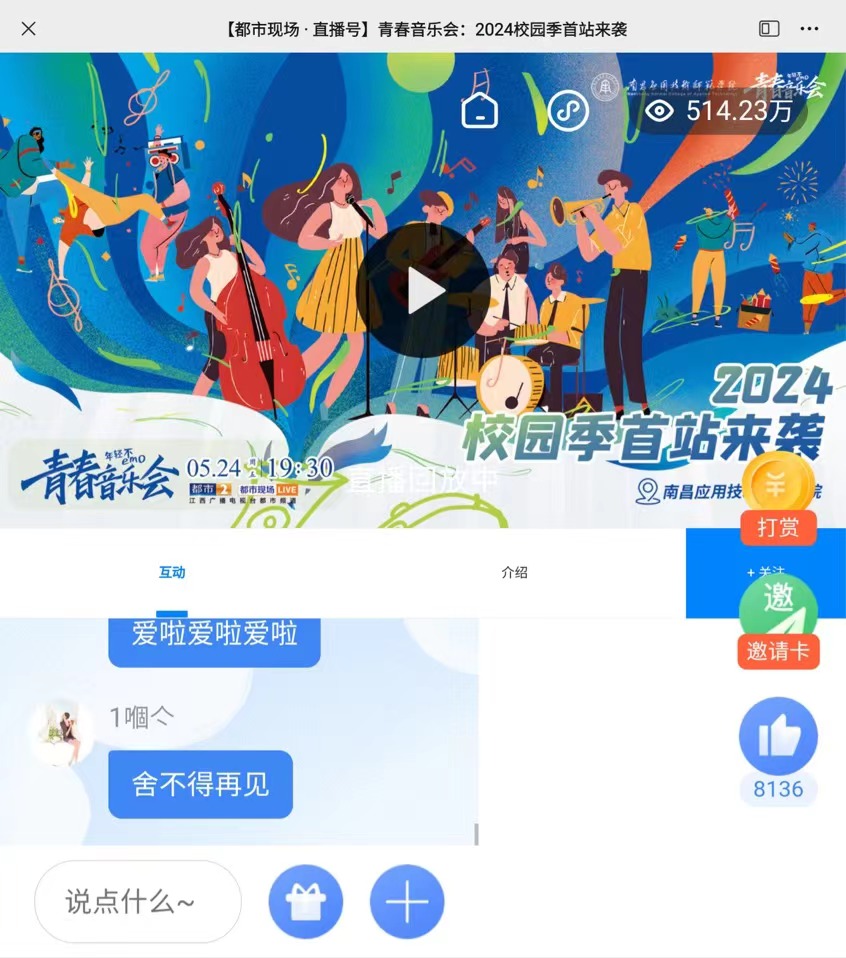 南昌應(yīng)用技術(shù)師范學(xué)院青春來襲,攜手都市現(xiàn)場共同點(diǎn)亮《青春音樂會》校園季首站514萬人在線觀看